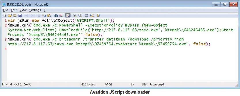 当执行时,JS附件将同时启动一个PowerShell和Bitsadmin命令来下载Avaddon勒索软件可执行文件到%Temp%文件夹并运行它。