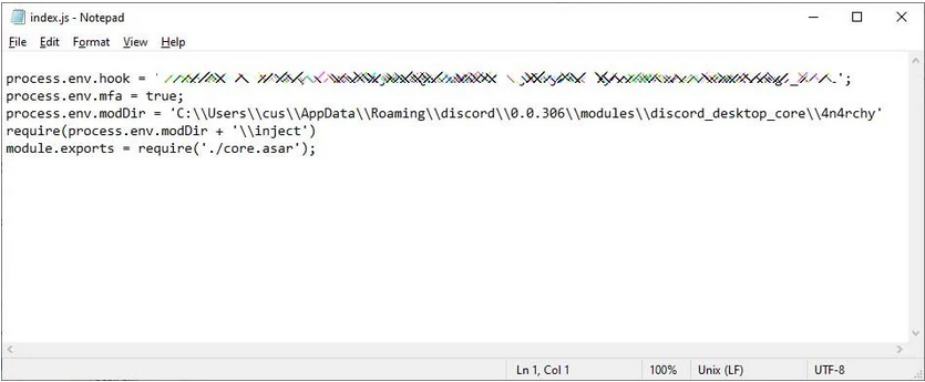 安装后,AnarchyGrabber3将修改Discord客户端的%AppData%/ /[version]/modules/discord_desktop_core/index.js文件,以加载恶意软件添加的其他JavaScript文件。